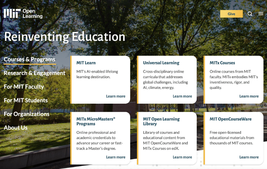 Entre los recursos que se ofrece de manera totalmente abierta se encuentran los del MIT OpenCourseWare, que publica de manera gratuita materiales de prácticamente todas las asignaturas que se imparten en el MIT (apuntes de clase, vídeos, exámenes…). Además, la Open Learning Library publica cursos y recursos sin ningún tipo de coste.