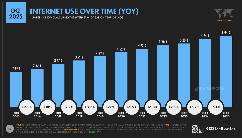 Un total de 6.040 millones de personas utilizaban internet en octubre de 2025, lo que supone el 73,2% de la población mundial.