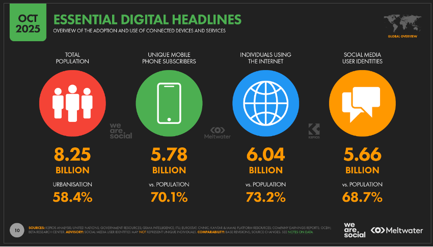La cifra de usuarios de las redes sociales ha alcanzado los 5.660 millones en octubre de 2025 (68,7% de la población mundial)