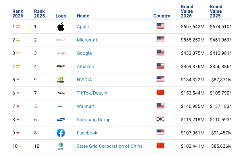 La número uno del ranking, Apple, aumentó en 2025 un 6% su valor de marca, para situarse en 608.000 millones de dólares. Microsoft, segunda, creció bastante más porcentualmente, un 23%, alcanzando un valor de 565.200 millones de dólares.