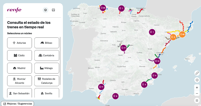 Renfe ha lanzado una web que permite consultar en tiempo real la situación de los trenes de cercanías de distintos núcleos de España.