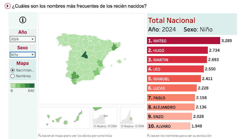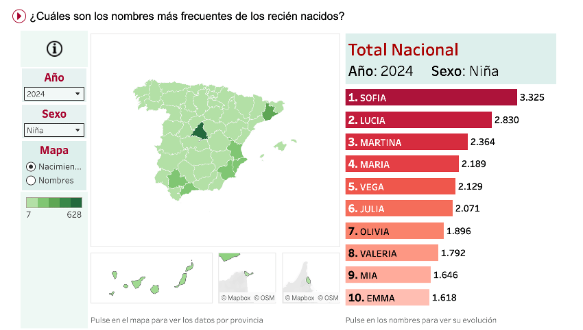 Este es el acceso a esta aplicación interactiva, que ofrece una visualización donde se muestran los 10 nombres de niña o niño más puestos en un año determinado, la distribución por provincias y un acceso a los datos concretos de cada nombre.